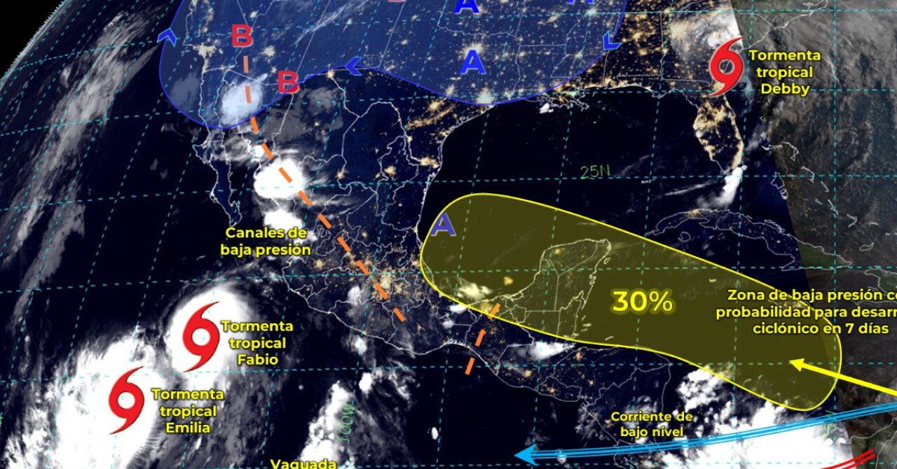 El Servicio Meteorológico Nacional (SMN) prevé que la tormenta tropical Fabio en combinación con otros fenómenos provocan lluvias de diferentes intensidades en la mayor parte del país, por lo que solicita a la población mantenerse informada para evitar riesgos.